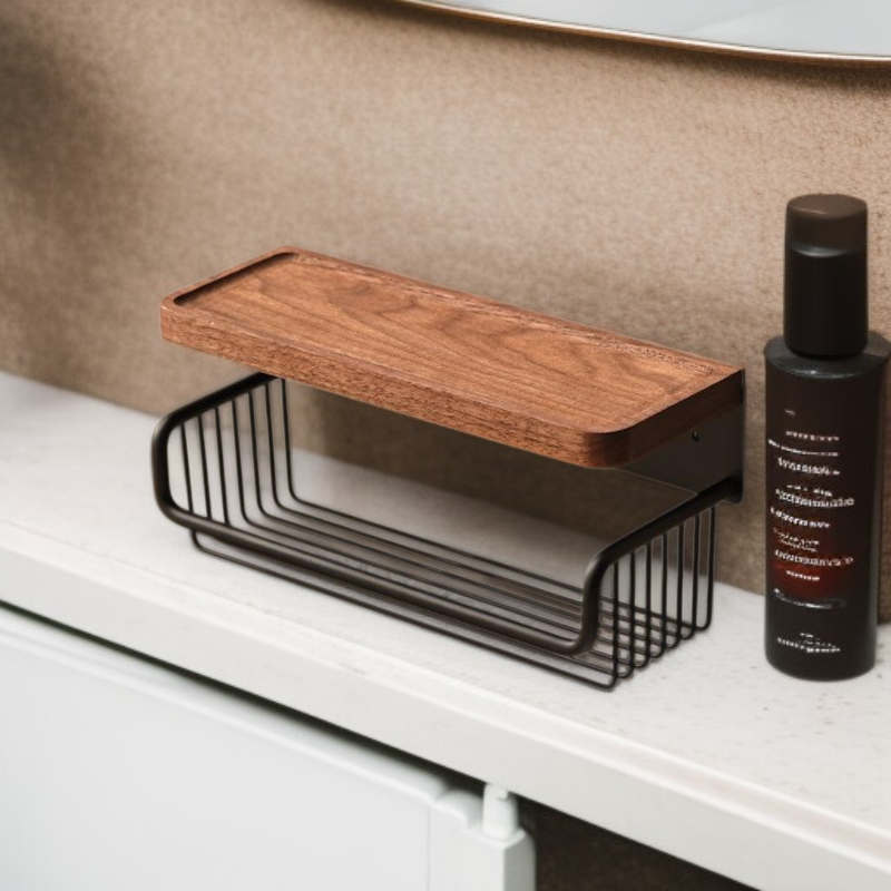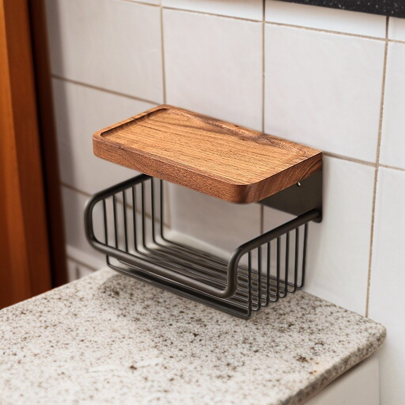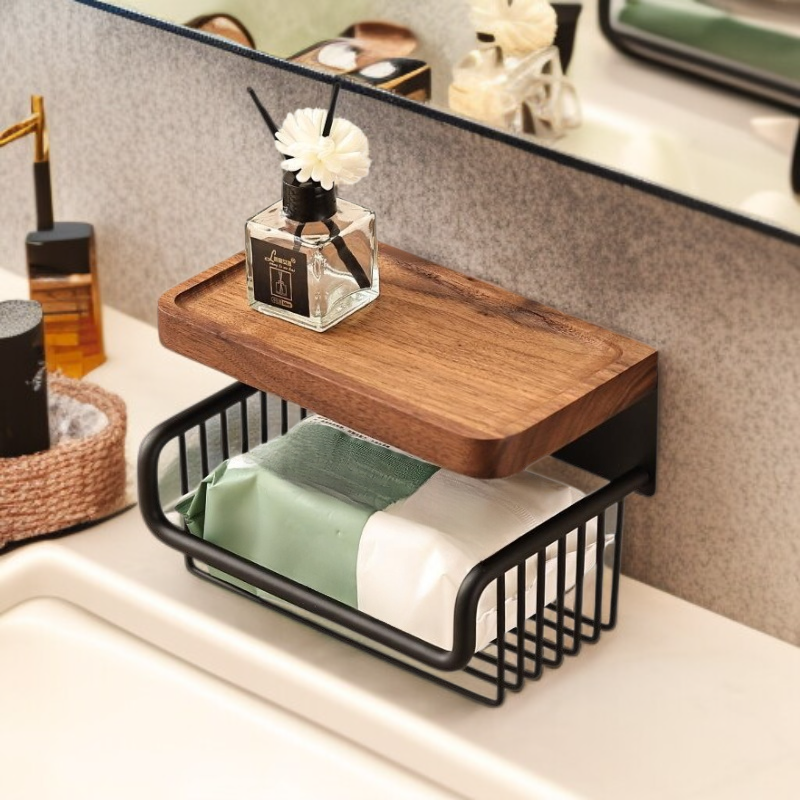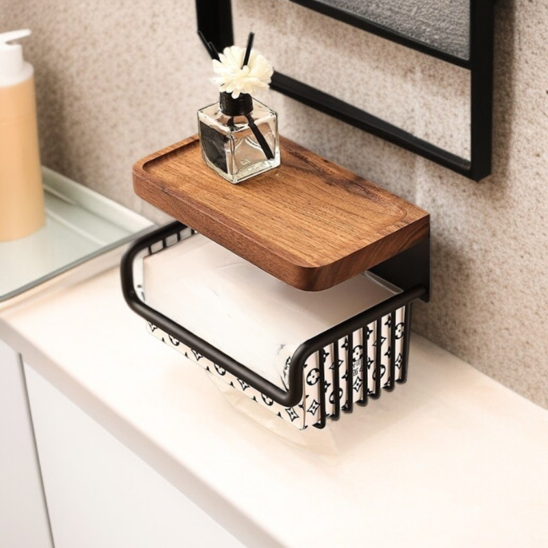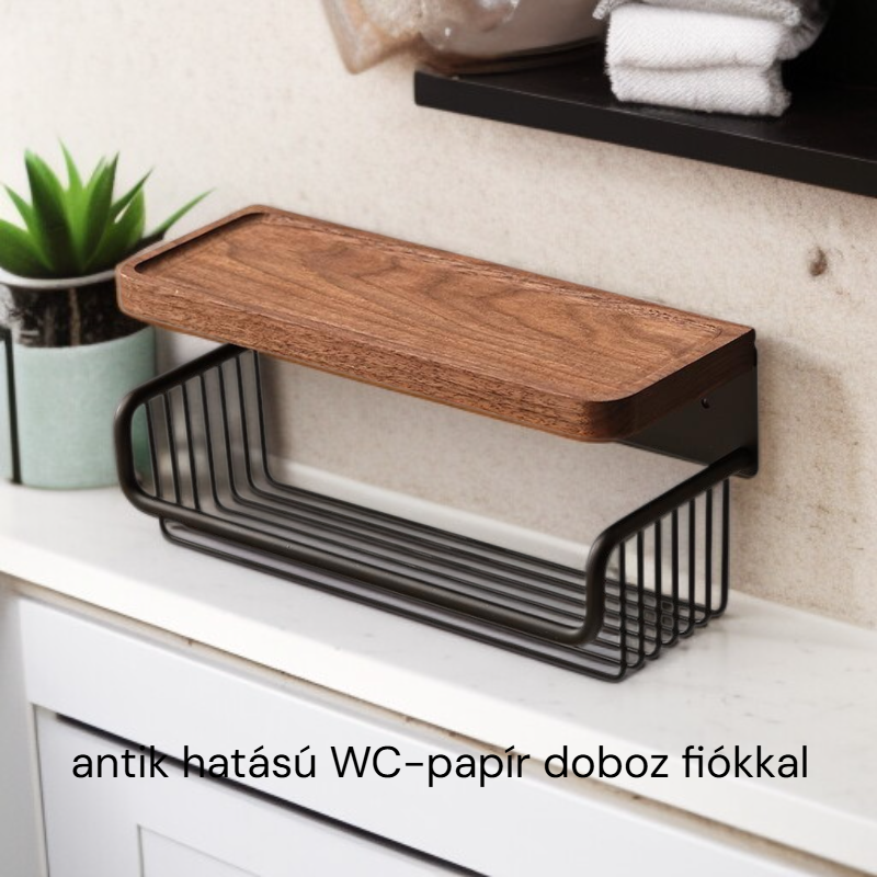Diófából készült, antik hatású WC-papír doboz, lyukasztás nélkül, fiókos és falra szerelhető